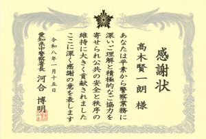 愛知県中警察 河合署長より感謝状を頂きました 2026.01.16