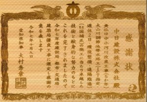 本日午後、愛知県庁正庁に於て、令和7年度愛知県建設局・都市・交通局・建築局優良工事施工業者の表彰式典が行われ、当社は『土木部門』で感謝状をいただきました。